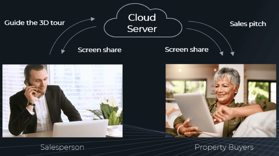 This solution is built upon 51Cloud, powered by 51WORLD 3D Interactive Sales System. The cloud server runs the 3D sales system and shares screens with both salespeople and property buyers, accommodating the delivery of the sales pitch by the salesperson.